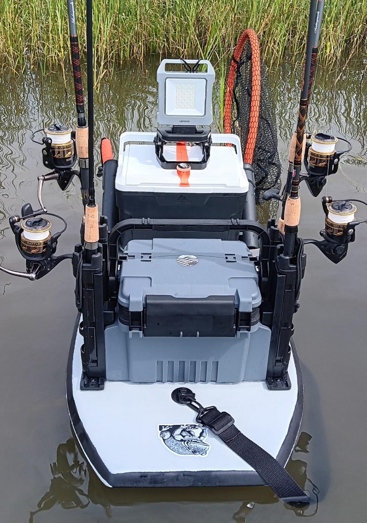 Cooler / Dry Storage: 10 qt/14 can Ozark Trail mini-cooler (9’x9″x12″) with handle for double handed carrying combined with tackle box handle (recommended land carrying method) Pull knob on cooler lid for easy two finger opening. Two additional diagonally mounted rod holders on cooler for convenient carrying of landing net and boga grips. DO NOT CARRY FLOUNDER GIGS or FISHING POLES IN COOLER ROD HOLDERS !!!